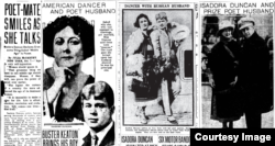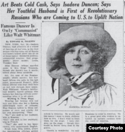 Владимир Абаринов: Насколько я понимаю, Айседора сама сорвала себе гастроли своим политическим темпераментом – несмотря на предупреждения импрессарио Сола Юрока, она не могла удержаться от политических монологов, восхваляющих русскую революцию, и этим навлекла на себя гнев публики, не говоря уже о фривольных нарядах, с трудом допустимых в Нью-Йорке, а уж в провинции и подавно. А тут еще и Есенин впадает в депрессию и скандалит. И вот тогда в его отношении к Америке появляется традиционный мотив американского мещанства, американского провинциализма, характерный и для других советских визитеров. Особенно Маяковский потом эту тему разовьет: мол, небоскреб новый, а клопы в нем те же самые.