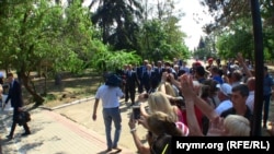 Ближе к полудню небесную гладь над курганом начали рассекать вертолеты, один из которых, по всей видимости, приземлился неподалеку. Через несколько минут возле одного из въездов появилось несколько черных иномарок с «мигалками». Увидев это, присутствующие горожане и гости Севастополя все как один ринулись к автомобилям и, словно по команде, выстроились в идеально ровную шеренгу, готовясь к встрече.