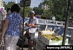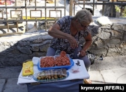 В боковой улочке молодой крымский татарин спешит распродать виноград, пока не появилась полиция. Торговля местными фруктами в центре Ялты властями не приветствуется.