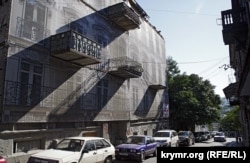 Новый для Крыма тренд, по крайней мере, сам до сих пор не видел – закрывать здания фотообоями. Выглядит симпатично, но, похоже, ремонт не ведется. Может, здание продают и в ожидании покупателя закрыли фасад, чтобы не мозолил глаза обвалившейся штукатуркой»?