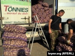 Среди множества фур находим с грузовик с сумскими номерами, в котором лежит картофель. Водитель признается, что успел заехать в Крым еще до блокады. Оптовая цена картошки чуть выше средней – 25 рублей за килограмм, однако покупатели берут ее охотно.