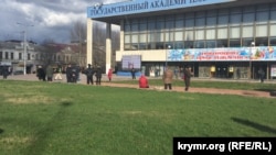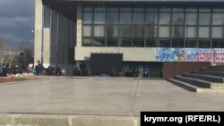 Ближе к 12 часам, когда должна была начаться трансляция из Москвы, мастера включили телеканал «Первый крымский» (в прошлом – ГТРК «Крым»). На площади стали собираться люди, однако их было не более двух-трех десятков, в том числе сотрудники правоохранительных органов. Одни стояли в нескольких метрах от экрана, другие решили присесть у подножия памятника Ленину напротив.