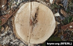 Журналисты выяснили, что деревья эти были посажены в 1940 году, перед войной, какой-то женщиной. Значит, на момент гибели им было немногим более 70 лет, для этих пород деревьев – возраст расцвета. Я, чтобы проверить информацию, попросил у знакомого, снимавшего летом 2011 года хронику гибели улицы Горького, поделиться фотографиями. Вот фотография пня спиленного тогда каштана. Я насчитал более 65 четких годовых колец только до треснувшей при спиле сердцевины. Так что все сходится, сведения верные.