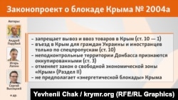 Так же, как и проект Сыроед-Чубарова, документ Парубия содержит норму о признании оккупированной неподконтрольной Украине части Донбасса. Еще одним сходством является то, что законопроект № 2004а запрещает провоз через административную границу с полуостровом грузов и товаров.