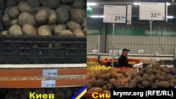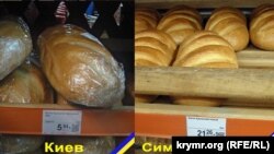 Фотографии прилавков с продуктами и ценами расположены рядом, слева – супермаркет в Киеве, справа – в Симферополе. Чтобы не было ошибок, фотографии подписаны и помечены цветами флагов Украины и Крыма.