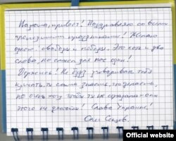 «Надюша, привет! Желаю тебе одного: свободы и победы! Это хоть и два слова, но смысл для нас один, – пишет Сенцов. – Держись! Не буду уговаривать тебя кушать, ты сама знаешь, что делаешь, но очень хочу, чтобы ты не страдала – они этого не достойны! Слава Украине!»