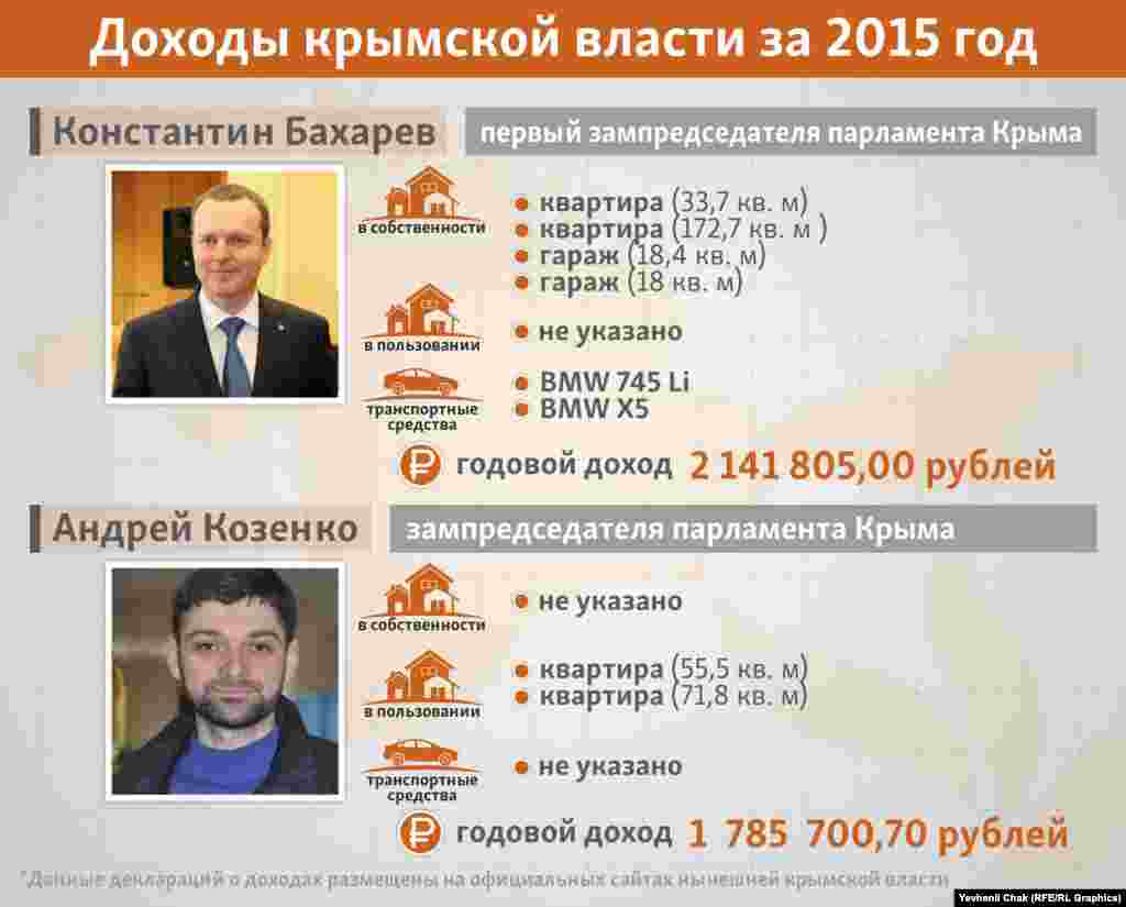 Подконтрольные России крымские власти обнародовали информацию о своих доходах и имуществе за 2015 год. Предлагаем ознакомиться, чем официально владеют крымские чиновники и во сколько они обходятся налогоплательщикам.