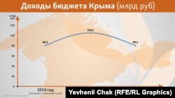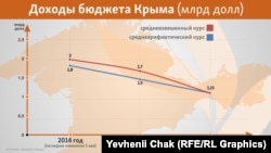 Щедрый денежный дождь из центра привел к раздуванию крымской казны в рублевом эквиваленте. Сразу после аннексии Симферополь распоряжался 80 млрд рублей, а через год – уже 103 млрд. Но в реальности картина была вовсе не такая радужная. Год 2014 начался с курса 32,6 рублей за 1 доллар, а закончился с 56,2 рублями, т.е. в среднем 44,5 рубля за доллар. В случае с крымским бюджетом это означало 80,2 млрд / 44,5 = 1,8 млрд долларов. В целом неплохо.