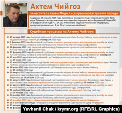 Ахтема Чийгоза арестовали по подозрению в организации массовых беспорядков в феврале 2014 года, когда прошли два митинга — на одном крымские татары и проукраинские активисты выступили против сепаратистских законов, а другой был организован партией «Русское единство». На втором погибло в давке два человека.