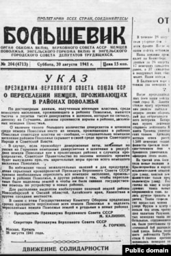 28 августа 1941 года был принят Указ Президиума Верховного Совет «О переселении немцев, проживающих в районах Поволжья». Написан он уже в обвинительном ключе («По достоверным данным, полученным военными властями, среди немецкого населения, проживающего в районах Поволжья, имеются тысячи и десятки тысяч диверсантов и шпионов, которые по сигналу, данному из Германии, должны произвести взрывы в районах, населенных немцами Поволжья. О наличии такого большого количества диверсантов и шпионов среди немцев Поволжья никто из немцев, проживающих в районах Поволжья, советским властям не сообщал, – следовательно, немецкое население районов Поволжья скрывает в своей среде врагов советского народа и Советской власти…»). Согласно последующим решениям руководства СССР, немцы были депортированы из Украинской ССР, из других районов их проживания.