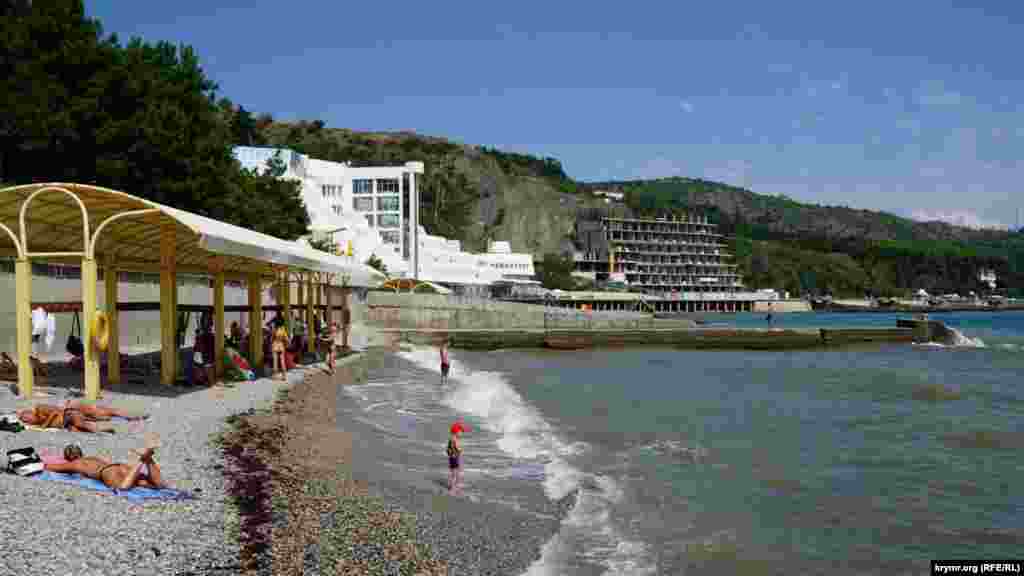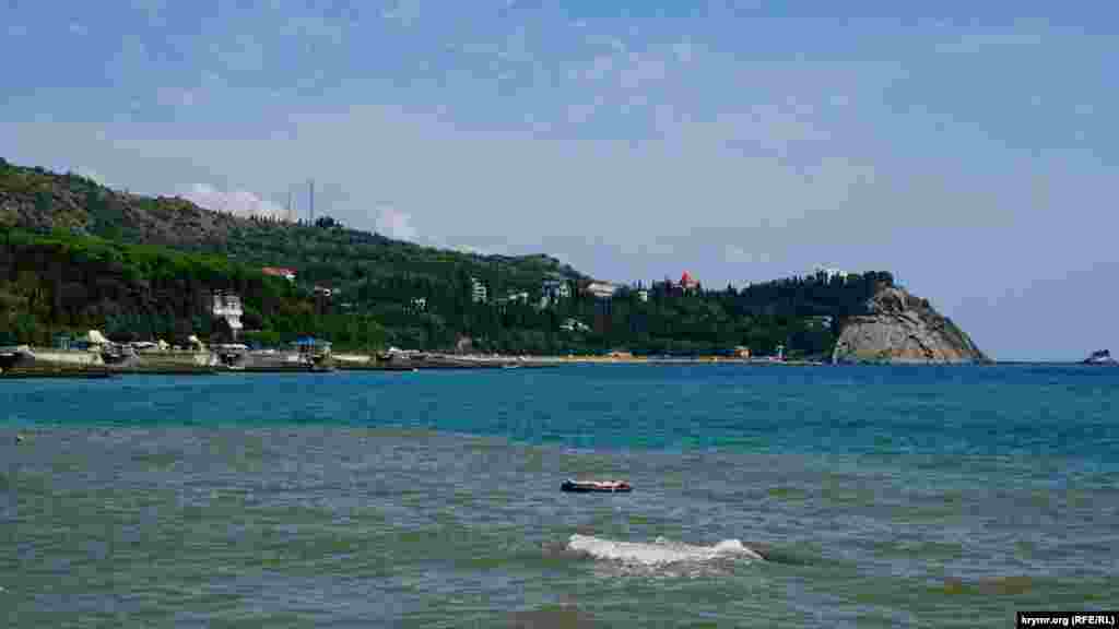По правую руку от Посейдона на фоне крутых склонов мыса Тепелер, и Аю-Дага за ним, растянулись пляжи для клиентов санатория «Айвазовский