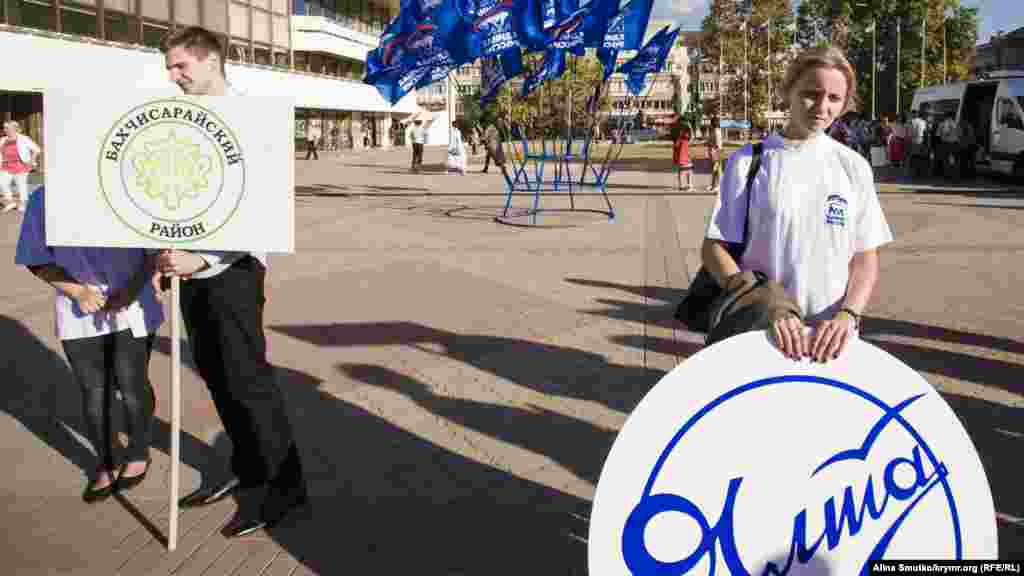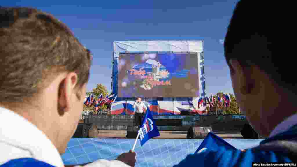 В предверии выборов в Государственную Думу России на территории Крыма, которые Украина признала нелигитимными, на площади Ленина в Симферополе проводят концерт под флагами партии «Единая Россия». На подходе к сцене стоят рамки металлоискателей, территория проведения концерта оцеплена, прилегающие к площади улицы перекрыты.