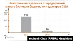 А это означает сокращение налоговых поступлений в бюджет. Например, в 2015 году крымский малый бизнес выплатил налогов на сумму чуть более 1 млрд рублей (порядка 16 млн долларов США). В то же время, в 2011 году сумма доходов, принесенных малым бизнесом в Крыму, составила 1,06 млрд грн (около 132 млн долларов США) или почти 17% от всей суммы налогов и сборов. Иными словами, в 2015 году размер налоговых поступлений от малого бизнеса в Крыму, в сравнении с 2011 годом, сократился в 8 раз.