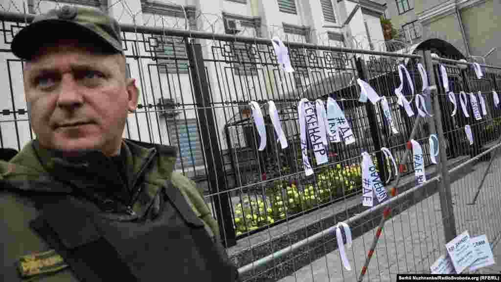 Пикетчики привязывают к забору посольства России белые ленты с именами похищенных