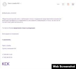 Выяснилось, что 18 октября компания распространила среди крымских СМИ пресс-релиз под заголовком: «В Крыму итальянскому депутату региона Венето подарили апартаменты».