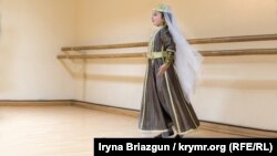 Ольга Московская родом с Донбасса, в Киеве живет вот уже более десяти лет, пришла в крымскотатарский ансамбль около года назад. Сначала искала курсы крымскотатарского языка – очень хотела его выучить. Курсов не нашла, но увидела объявление о наборе девушек в студию. Сейчас танцует в ансамбле и получает от этого огромное удовольствие.