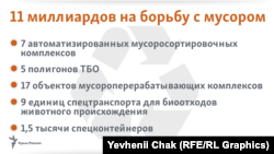 Основная стратегия чиновников по борьбе с твердыми коммунальными отходами заключается в строительстве комплексов по сортировке и переработке мусора. Об этом еще в начале января заявлял крымским СМИ министр ЖКХ подконтрольного России правительства Крыма Александр Жданов. «Для реализации проектов необходимо более 9 миллиардов рублей инвестиций, 171 гектаров земли и 15,5 мегаватт электричества», – говорил он.