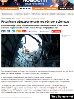 Во вторник, 31 января, на сайте российского канала «Звезда» со ссылкой на «Донецкое агентство новостей» сообщали: «Под обстрел попала группа наблюдателей российских офицеров из Совместного центра по контролю и координации режима прекращения огня на Донбассе (СЦКК). В сообщении отмечается, что огонь по группе офицеров, которые фиксировали разрушения в Киевском районе Донецка, открыли украинские военные».