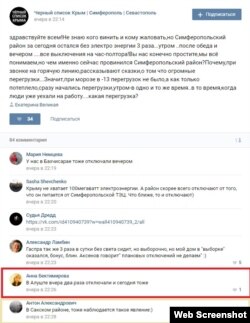 Жалобы на отключения света и связанные с этим неудобства поступают почти из всех регионов Крыма. Так, в Керчи, по сообщению местных СМИ, 28 января без света осталось около трети города. Операторы управления «Крымэнерго» по телефону сообщали керчанам, что причиной отключения является авария в сетях. Однако у некоторых горожан возникли подозрения в том, что свет отключают планово.