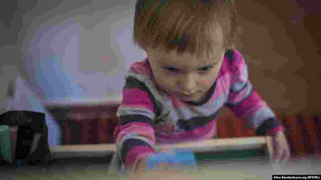 Амира играет с жирафом, которого ей подарили члены организации «Наши дети» («Бизим балалар»), взявшие под временную финансовою опеку детей крымских политзаключенных и пропавших без вести крымчан