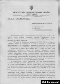 По данным ведомства, санаторий и его корпуса расположены на земельном участке площадью 5,6 гектаров, которые были предоставлены ему в постоянное пользование для лечения и оздоровления граждан еще в 1998 году. Свою позицию относительно решения о ликвидации санатория в МОЗ Украины формулируют выдержкой из закона об оккупированной территории: «Любой акт (решение, документ), выданный органами, их должностными лицами на временно оккупированной территории, являются недействительными и не создают правовых последствий».