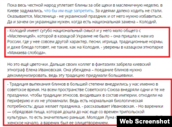Далее издание приводит цитату этнографа Елены Ивановской, которая якобы убеждена, что поедание блинов нужно декоммунизировать. «Традиция выпекания блинов в большей степени внедрились у нас именно в советское время, ‒ говорит она. ‒ На всей территории Советского Союза внедряли одни и те же праздники, чтобы традиции этносов, входивших в состав империи, отходили на периферию и их не вспоминали. Ведь это нормальная биологическая потребность: душа просит праздника. Но вареники ‒ обрядовая пища, которая дошла до нас еще со времен «трипольской культуры», то есть значительно раньше. Молодой месяц символизировал собой женское начало, а вареник был его олицетворением».