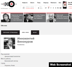 Пользователь Иннокентий Винокуров, назвавшийся финансовым аналитиком, зарегистрирован в блоге «Эха Москвы» с 2017 года и пока имеет только один пост.