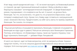 Дальше представлено мнение эксперта. «Чешская Республика не хочет принимать беженцев, Словения отказывается. Беженцев же надо куда-то девать? Нельзя же запихнуть всех беженцев в Германию. Поэтому, естественно, что безвизовые страны, такие как Грузия и Украина, тоже будут принимать беженцев», ‒ говорит руководитель юридического консалтингового агентства Марк Линцевски.