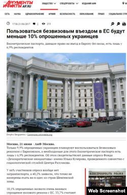 Об этих же «10%» сообщили и другие СМИ. «Пользоваться безвизовым въездом в ЕС будут меньше 10% опрошенных украинцев» ‒ с таким заголовком вышла новость на сайте издания «Аргументы и факты».