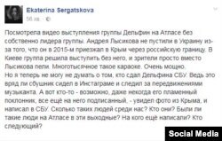 Кроме восторга от выступления без солиста и поддержки решения СБУ, были и те, кто возмутился запрету въезда певцу. Журналистка Екатерина Сергацкова, которая сейчас работает в «Украинской правде», на своей странице в фейсбуке задала риторический вопрос: кто «сдал» Андрея Лысикова в СБУ, чтобы ему запретили въезд в Украину.