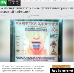 Так, канал Минобороны России со ссылкой на сайт газеты «Вести», выходящей в Украине, отмечает: «На улицах украинской столицы появилась реклама, которая агитирует отказаться от «русского языка», сравнивая его с инфекцией. Снимками, на которых изображены ситилайты со скандальными надписями, делятся пользователи социальных сетей. На плакате представлен человек с высунутым языком, который разделен на три секции и раскрашен в разные цвета. Секции подписаны словами: империализм, агрессия, война, сепаратизм и смерть».