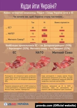 Несколько прохладнее относятся к Альянсу жители юга и востока Украины ‒ 12% поддерживают вступление. В ряде областей высокая доля респондентов уклонились от четкого ответа. Например, в Донецкой области до 46% граждан не смогли сказать, как относятся к НАТО, и только 4% выразили однозначную поддержку. Об этом свидетельствует опрос, проведенный в областях юга и востока в январе-марте 2017 года компанией GfK по заказу Института массовой информации.