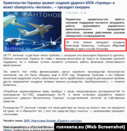 Интересно, что, например, российский пропагандистский сайт «Русская весна» написал, что правительство Украины срывает создание ударного БПЛА «Горлица» и может довести до банкротства завод «Антонов». В тексте «Русской Весны» присутствуют те же цитаты, которые содержались в так называемом «письме», но написано, что якобы об этом заявил президент концерна Александр Кривоконь. А сайт top-n.ru написал, что якобы об этом сообщили «Крым 24» в пресс-службе предприятия.