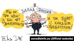 Ниже российский карикатурист Сергей Елкин иллюстрирует, как он видит двоесловие российского президента об отравлении Скрипаля ‒ с одним дезинформационным тезисом, ориентированным на Запад, и совсем другим пропагандистским нарративом, направленным на внутреннюю российскую аудиторию.