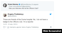 В публичной переписке с Макеем Евгений Поддубный признал, что на видео ‒ офицеры российского Центра по примирению враждующих сторон в Сирии. По словам российского журналиста, они просто «идут обедать в местное кафе». Поддубный также заявил, что с мальчиком и его отцом он познакомился через свои источники в больнице Думы, а на прямой вопрос о том, было ли интервью записано в офицерском клубе, ответил отрицательно.