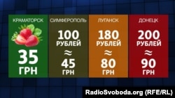 Тем не менее, 90 гривен в украинском эквиваленте за кило клубники ‒ не предел. В оккупированном Донецке клубнику можно купить и за 100 гривен за килограмм. Причина ‒ более сладкий сорт клубники, говорят продавцы.