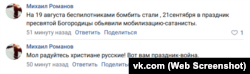 «На 19 августа беспилотниками бомбить стали, 21сентября, в праздник пресвятой Богородицы, объявили мобилизацию – сатанисты. Мол, радуйтесь, христиане русские! Вот вам праздник - война!» – пишет Михаил Романов.