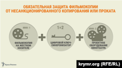 Крым.Реалии уже проводили исследование вопроса теле- и кинопродукции в Крыму. Тогда директор симферопольского кинотеатра имени Шевченко Владимир Мирошниченко рассказал, что, поскольку после перерегистрации официальные документы показывают крымские кинотеатры, как предприятия России, дистрибьюторы не могут отказать в предоставлении фильмокопий кинотеатрам, ведь за этим может последовать жалоба в ФАС от последних. Тем не менее, источник Крым.Реалии из сферы кино в Крыму, не так оптимистичен: «Перерегистрация юридических лиц – это «мыльный пузырь», который может лопнуть в любой момент. Дело в том, что все фильмокопии имеют ключ (пароль), который синхронизирует фильмокопию с проектором. Существует реестр этих проекторов, и любой правообладатель по серийному номеру оборудования может определить на какой территории расположен данный проектор, компания какой страны его приобретала, где и у кого, и за каким кинотеатром закреплено оборудование. Перерегистрация – это попытка «закрыть глаза», но очень слабая. Ведь, идентификационные данные крымского проектного оборудования не передавали российским дистрибьюторам от перерегистрировавшихся кинотеатров вновь, после аннексии. Дистрибьюторы взяли данные из реестра, как данные об украинских проекторах в украинских кинотеатрах».