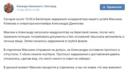 «Сегодня, около 16:00, в Евпатории задержали координатора нашего штаба Максима Климова и оператора-монтажера Александра Данилова. Максим и Александр запускали квадрокоптер на береговой линии, после чего приехала полиция, потребовала документы, и без оснований обыскала автомобиль и личные вещи. Затем началось задержание в грубой форме», – говорится в публикации.