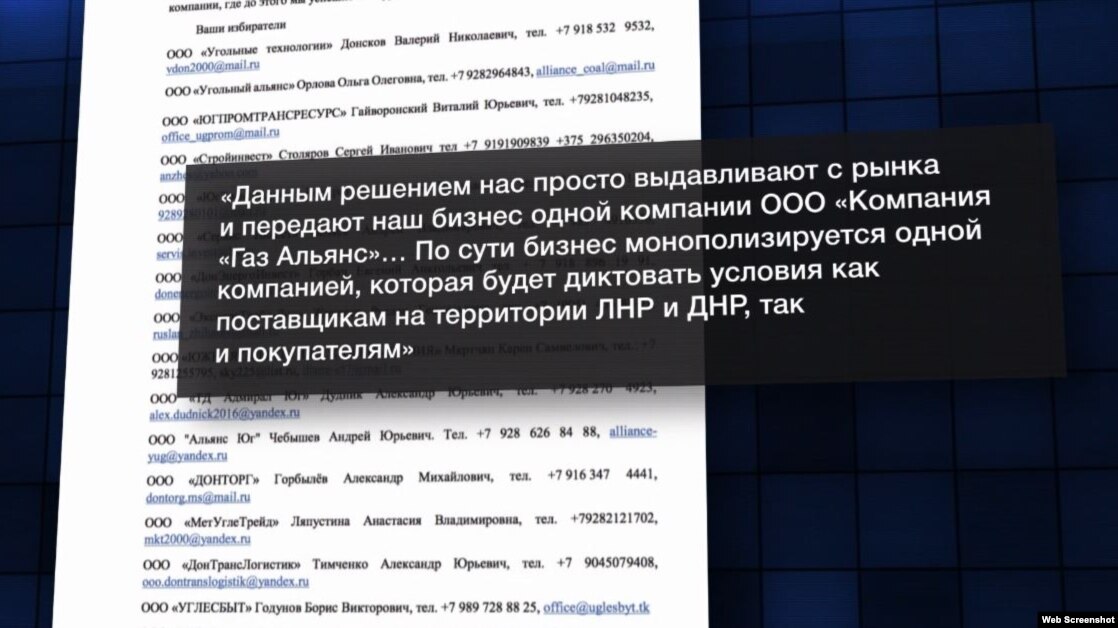 Монополистом на поставку и сбыт продукции с оккупированных районов Донецкой и Луганской областей стала фирма «Газ-альянс» украинского беглого олигарха Сергея Курченко. Весной этого года Министерство экономики России напрямую запретило другим трейдерам контактировать с группировками «ЛНР» и «ДНР». Обиженные российские фирмы даже написали коллективное письмо президенту России Владимиру Путину. Но безрезультатно. Структуры Курченко продолжают контролировать трафик угля и металла.