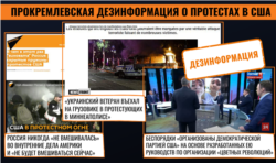 Несколько случаев на этой неделе указывают на вектор прокремлевской дезинформации в отношении протестов в США. Судя по всему, прокремлевские СМИ безо всяких на то оснований утверждают, что беспорядки якобы организованы Демократической партией США на основе разработанных ею руководств по организации «цветных революций» подобно «перевороту» 2014 года в Киеве, и что ветеран украинской армии въехал на грузовике в протестующих в Миннеаполисе. Агентство Спутник даже опубликовало заявление о том, что «Россия никогда не вмешивалась во внутренние дела Америки и не будет вмешиваться сейчас», имея в виду выборы в США в 2016 году, российское вмешательство в которые было неопровержимо доказано.