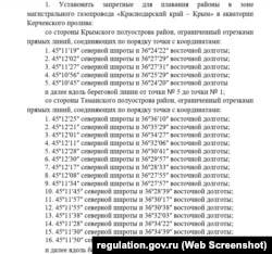 Запретные районы предполагается установить в акватории Керченского пролива в зоне магистрального газопровода «Краснодарский край – Крым». Проект соответствующего приказа Минтранса России опубликован на российском Федеральном портале нормативно-правовых актов и предусматривает введение ограничений как у берегов Крыма, так и возле Краснодарского края РФ.
