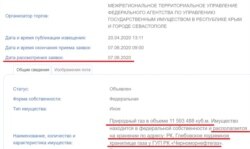 В документах говорится, что продаваемый газ является «федеральной собственностью» на основании постановления подконтрольного России мирового судебного участка № 92 Черноморского судебного района Крыма от 15 мая 2017 года.