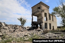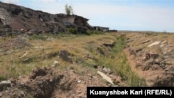 Руины городка «Г» (условное название городка в советское время) у горы Дегелен. В советские годы этот городок, подчинявшийся непосредственно Москве, находился на специальном обеспечении. Некоторые жители окрестных совхозов получали специальное разрешение и покупали здесь продукты питания. В городке быстро находили дефицитные запчасти для техники.