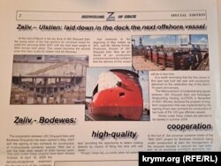 Например, рассказывается о сотрудничестве «Залива» с голландской компанией Damen Shipyards Bergum, для которой на заводе в Керчи изготавливали корпуса с последующей доукомплектацией судов. В частности, для голландской компании на «Заливе» построили судно CMM GRAVITY. Рассказывается и о контрактах на строительство корпусов судов для норвежской компании Ulstein.