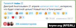 Также он потроллил экс-президента России Дмитрия Медведева, известного своими бурными постами в социальных сетях и мессенджерах. «Дмитрий Анатольевич 21 апреля написал этот пост, интересно, что будет ответной целью? Новый пост в Телеграмме?», – написал Талипов. При этом он имел в виду вот это сообщение Медведева: «Один из упоротых украинских начальников сказал о необходимости нанести удар по Крымскому мосту. Надеюсь, он понимает, что будет ответной целью».