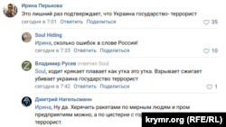 Когда уже опубликованы официальные сообщения от крымских властей, а соцсети полны фото и видео разрушенного моста, начинается поиск виновных. «Это лишний раз подтверждает, что Украина государство-террорист», – утверждает Ирина Перькова. Ей отвечает пользователь под ником Soul Hiding: «Ирина, сколько ошибок в слове Россия!». ( h )