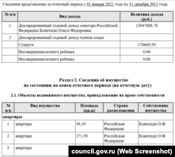 По итогам 2014 года, когда Ольга Ковитиди была впервые назначена сенатором от Крыма в Совете Федерации РФ, она задекларировала более трех миллионов рублей годового дохода. А в 2021 году на этом же посту она уже показала доход в 15 миллионов рублей за год.
