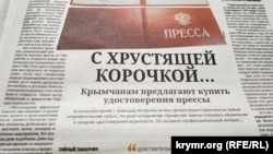 «Крымская газета» провела расследование и выяснила, что в сети Интернет можно приобрести удостоверение журналиста. По информации издания, некий Арсений предлагает любому желающему «стать журналистом», заплатив за «корочку прессы» 7500 рублей (около 2700 грн – авт.). «В стоимость входит прохождение дистанционного обучения в СМИ. Речь идет о семидневном мастер-классе по журналистике, после чего слушателям выдадут редакционные удостоверения, пресс-карты, пропуски на автомобиль и договоры. Консультационная поддержка тоже включена в стоимость», – сообщается в материале. Пропуск на авто обойдется в 2000 рублей (около 740 грн). «Судя по всему, «бизнес» Арсения удаленный и охватывает не только республику. Для привлечения потенциальных покупателей из Крыма он указал в объявлении местный адрес, по которому находится одна из сцен театра имени Горького», – пишет газета. В московском офисе интернет-издания, от имени которого торгуют документами, утверждают, что в редакции не продают удостоверения.