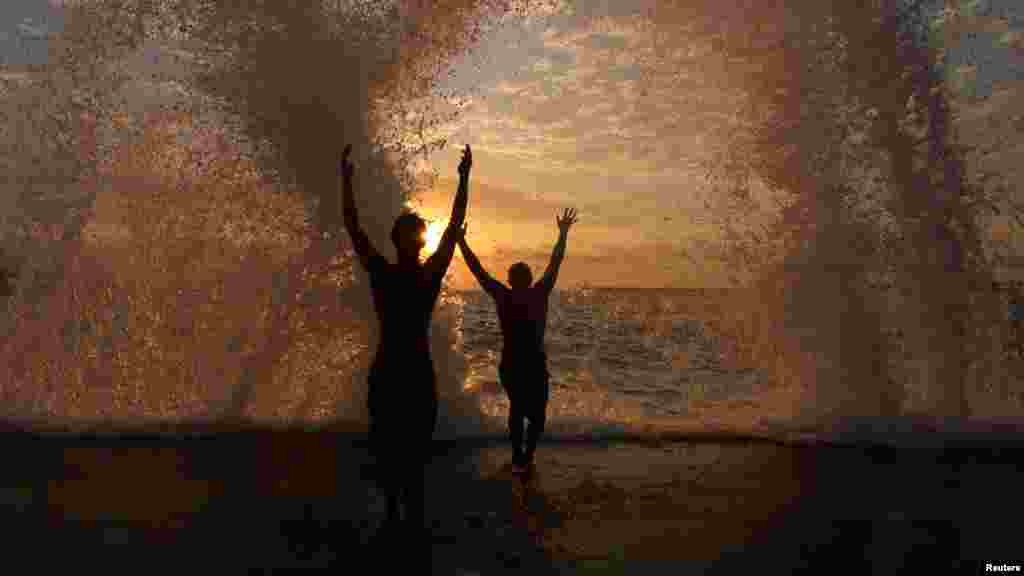 Штормовой ветер поднял волны Черного моря у берегов Севастополя. Это привлекло туристов: они с удовольствием плещутся в воде и фотографируются на фоне заходящего солнца.